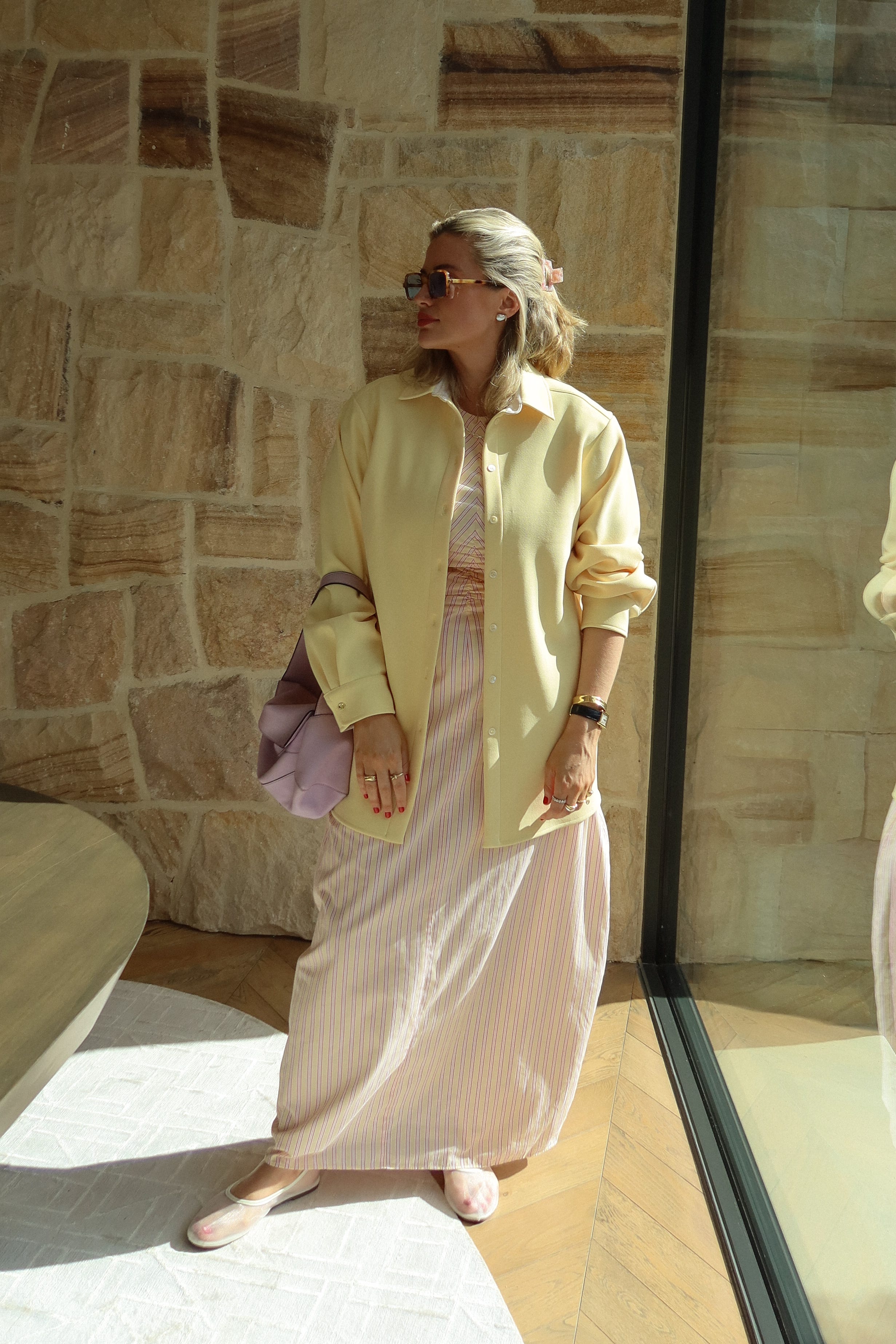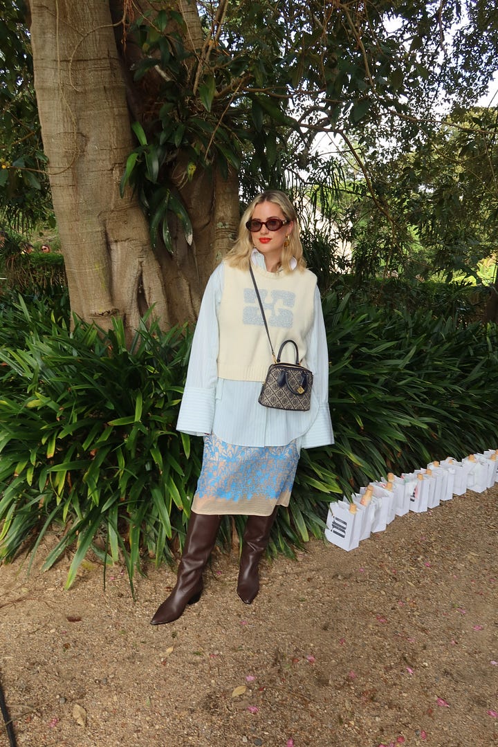 I wore soon to be released shirt and skirt from Lee Mathews, Ganni vest, boots from Aere, Tory Burch bag, Le Specs sunglasses and Mimco earrings.