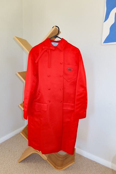I started the day with the P.E Nation show in my preloved red silk Prada coat (found another one here), my favourite COS tshirt, Lee Mathews pants, the same Adidas SL72s, my vintage dark chocolate brown Chanel flap bag (similar here), Mimco earrings and dark red Le Specs sunglasses.