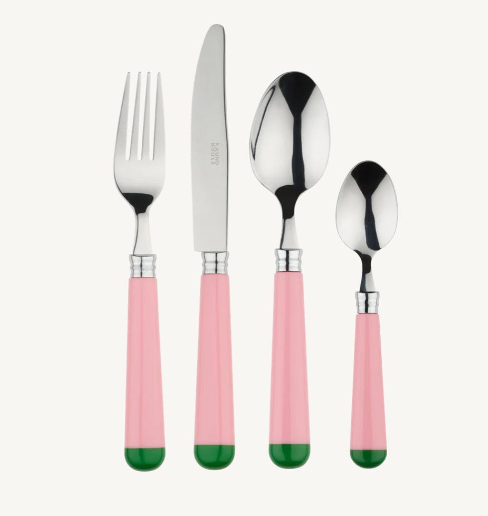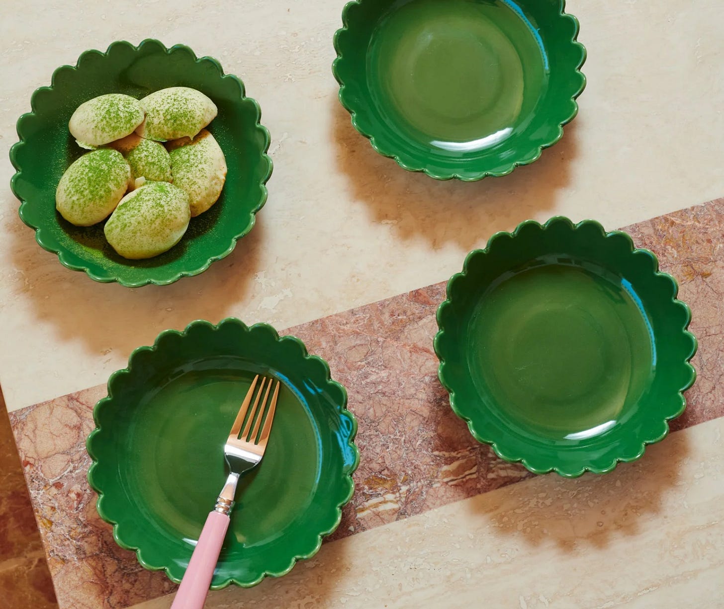 In The Roundhouse - these green scalloped plates. So cute. We have them in white and love them. And they’ve just made a version with a red edge. Matching napkin and placement set here.